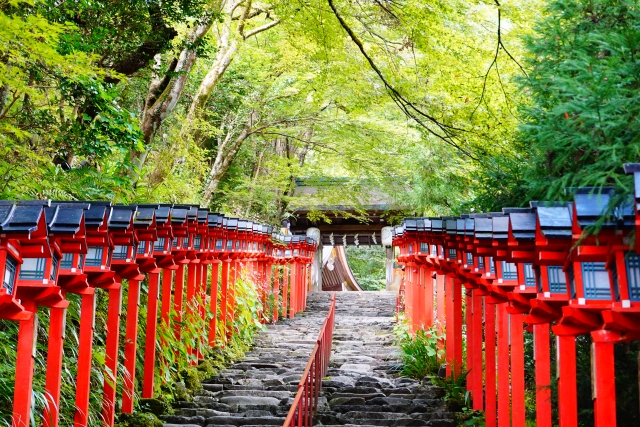 貴船神社は山間に位置し、他の紅葉スポットより少し早く色づき始めます。石段に並ぶ灯籠と紅葉のコントラストが幻想的で、昼と夜でまったく異なる表情を見せてくれます。
