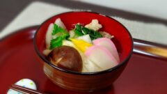 - 雑煮用の餅と具材(大根・鶏肉・小松菜など)